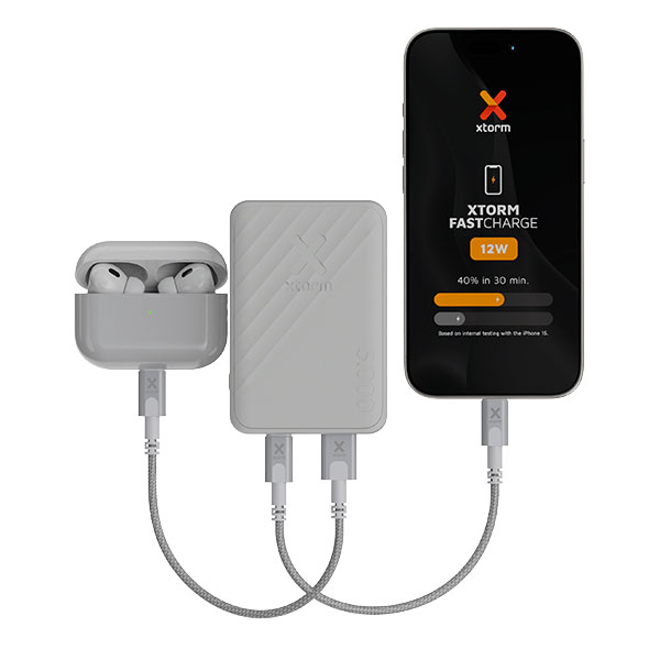 Xtorm 5000mAh fast charge powerbank Output: 12W Supplied with fast charge USB-A to USB-C cable