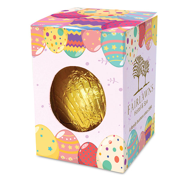 Easter Egg – Mini 18g milk chocolate egg Foiled in silver or gold Presented in a bespoke box Cocoa solids 35% minimum